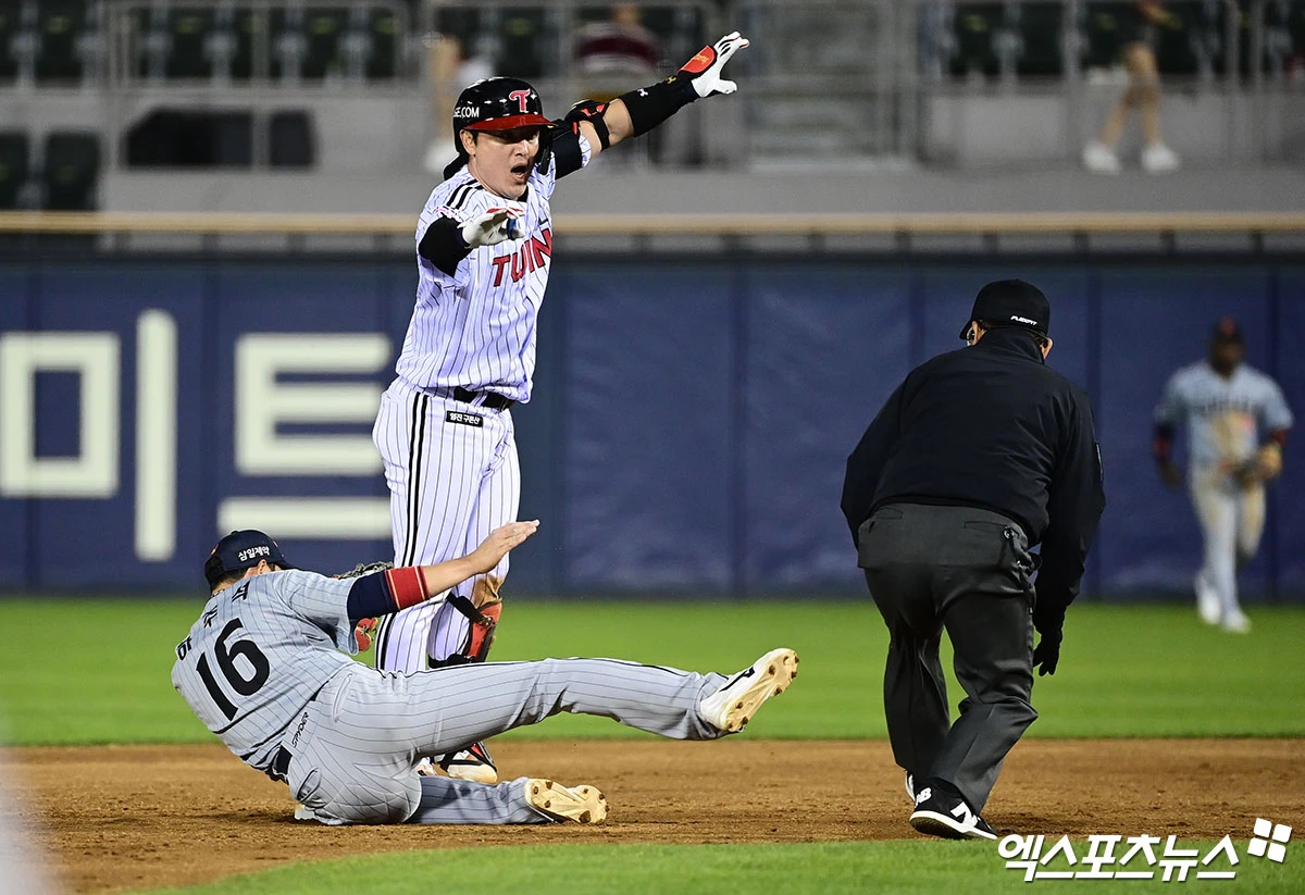 (엑스포츠뉴스 잠실, 박지영 기자) 22일 오후 서울 송파구 잠실야구장에서 열린 '2026 신한 SOL Bank KBO리그' 한화 이글스와 LG 트윈스의 경기, 4회말 1사 1루 LG 박동원이 중전 안타를 때려낸 뒤 2루까지 진루 시도했으나 한화 2루수 하주석에게 태그아웃 당하고 있다. 이후 LG측 요청으로 비디오 판독 실시했으나 원심 유지되며 아웃.