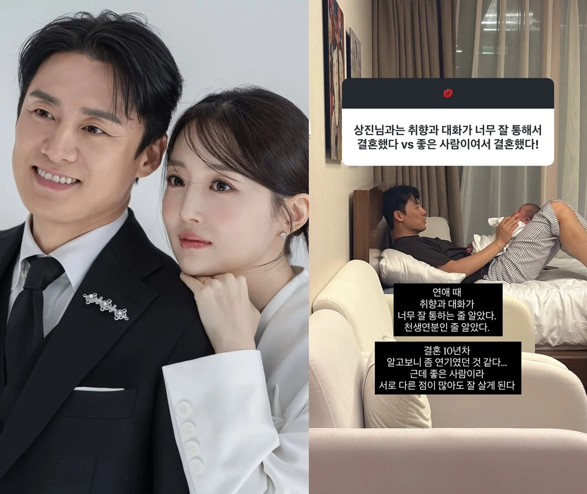 김소영은 "결혼 10년 차. 알고 보니 좀 연기였던 것 같다. 근데 좋은 사람이라 서로 다른 점이 많아도 잘 살게 된다"라며 연애 시절과는 사뭇 다른 오상진의 모습을 폭로하면서도 "좋은 사람"이라고 지칭하며 알콩달콩한 부부 사이를 드러냈다.