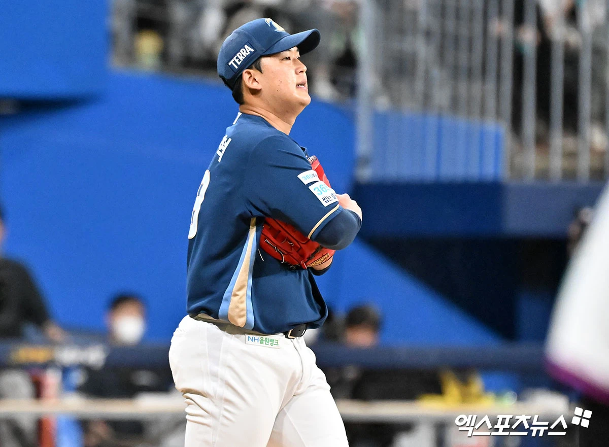 (엑스포츠뉴스 고척, 김한준 기자) 22일 오후 서울 구로구 고척스카이돔에서 열린 '2026 신한 SOL Bank KBO리그' NC 다이노스와 키움 히어로즈의 경기, 6회말 무사 1루 NC 신민혁이 키움 박주홍에게 볼넷을 허용한 후 아쉬워하고 있다.