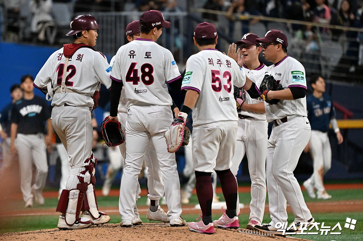 이날 경기에서 승리한 키움 선수들이 기뻐하고 있다.