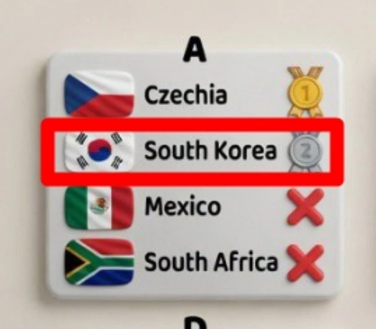 체코와 한국이 나란히 조 1, 2위를 차지해 32강 토너먼트 진출을 확정 지을 것으로 예상된 가운데, 놀랍게도 개최국 중 하나인 멕시코가 조 3위를 차지했을 뿐만 아니라 3위팀 상위 8개국에 속하지 못해 토너먼트 진출권도 얻지 못할 것으로 나왔다.