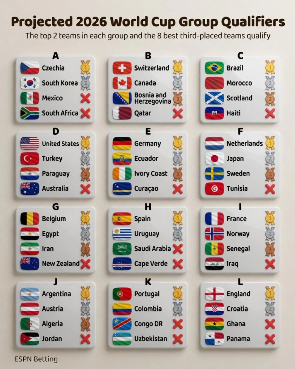 매체가 토너먼트 진출권을 얻을 것으로 예상한 3위팀 8개국은 보스니아 헤르체고비나(B조), 스코틀랜드(C조), 파라과이(D조), 코트디부아르(E조), 스웨덴(F조), 이란(G조), 세네갈(I조), 알제리(J조)다. 멕시코와 달리 캐나다와 미국은 각각 B조 2위, D조 1위에 올라 토너먼트에 올라갈 것으로 계산됐다.
