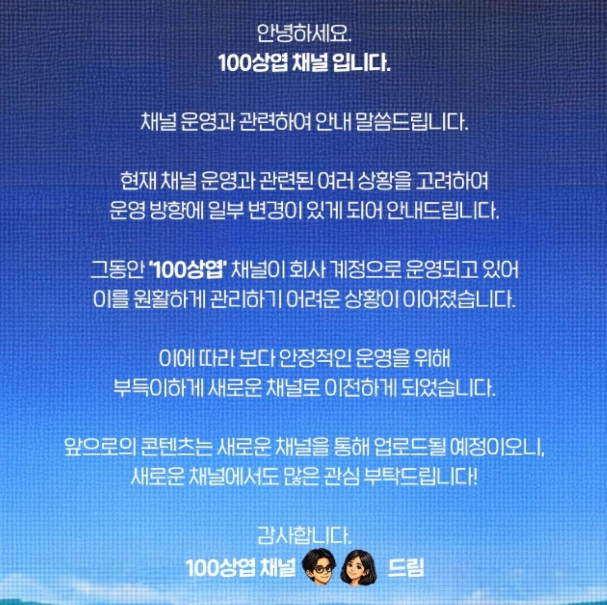 그러면서 "앞으로의 콘텐츠는 새로운 채널을 통해 업로드될 예정이오니, 새로운 채널에서도 많은 관심 부탁드립니다"라고 덧붙였다.