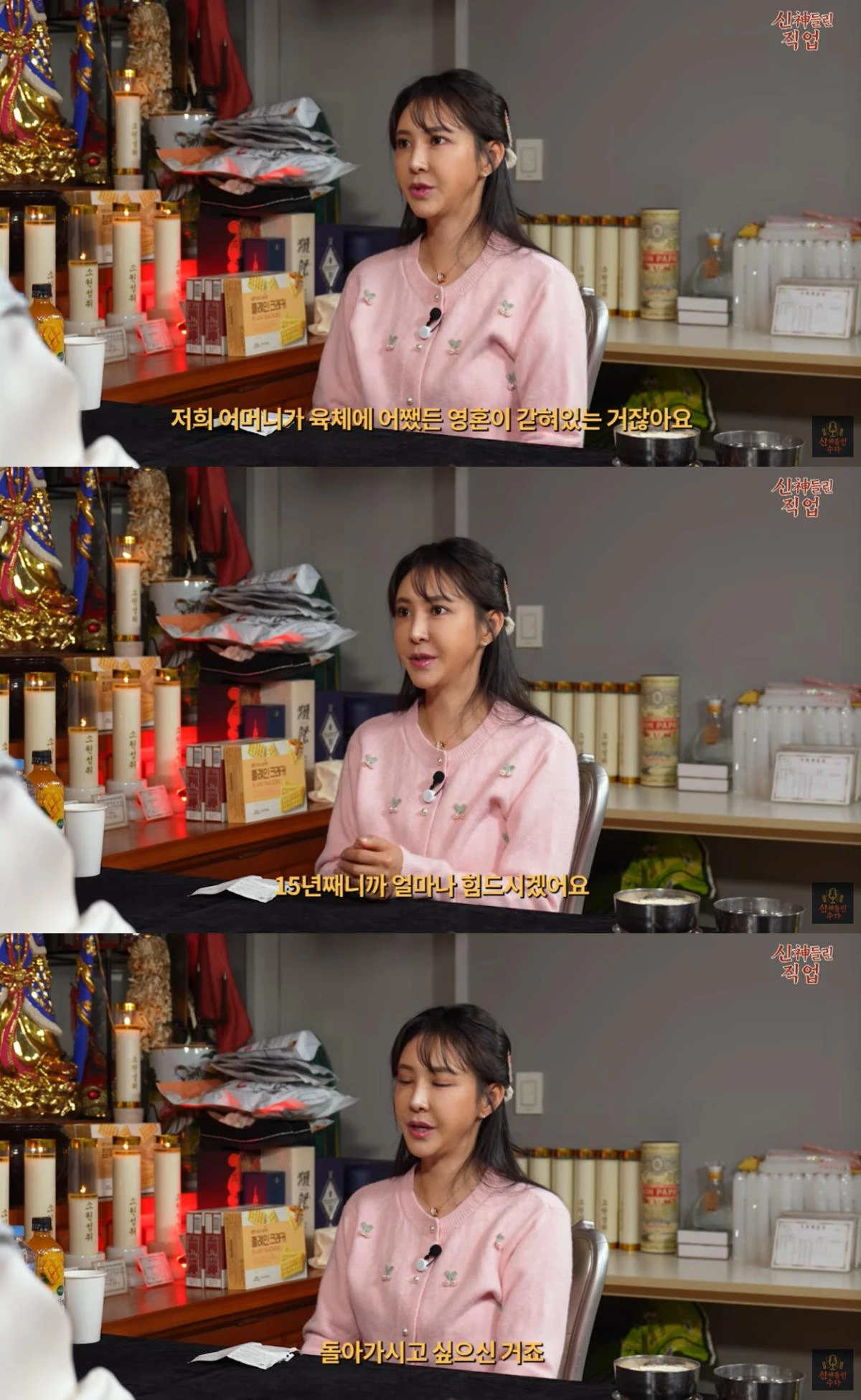무속인은 점을 보던 중 "안 좋은 사람이 있다는 말이 나온다. 아줌마가 드러누워 있다"며 "명줄 가지고는 말 안하는데, 하지만 이번 년도는 좀 어려우시겠다"고 이야기했다.