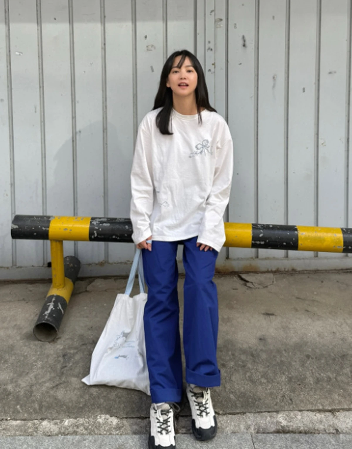 화이트 톱과 블루 팬츠, 에코백을 매치한 스타일링은 꾸민 듯 안 꾸민 듯한 '꾸안꾸' 매력을 자아내며 자연스러운 분위기를 더했다.