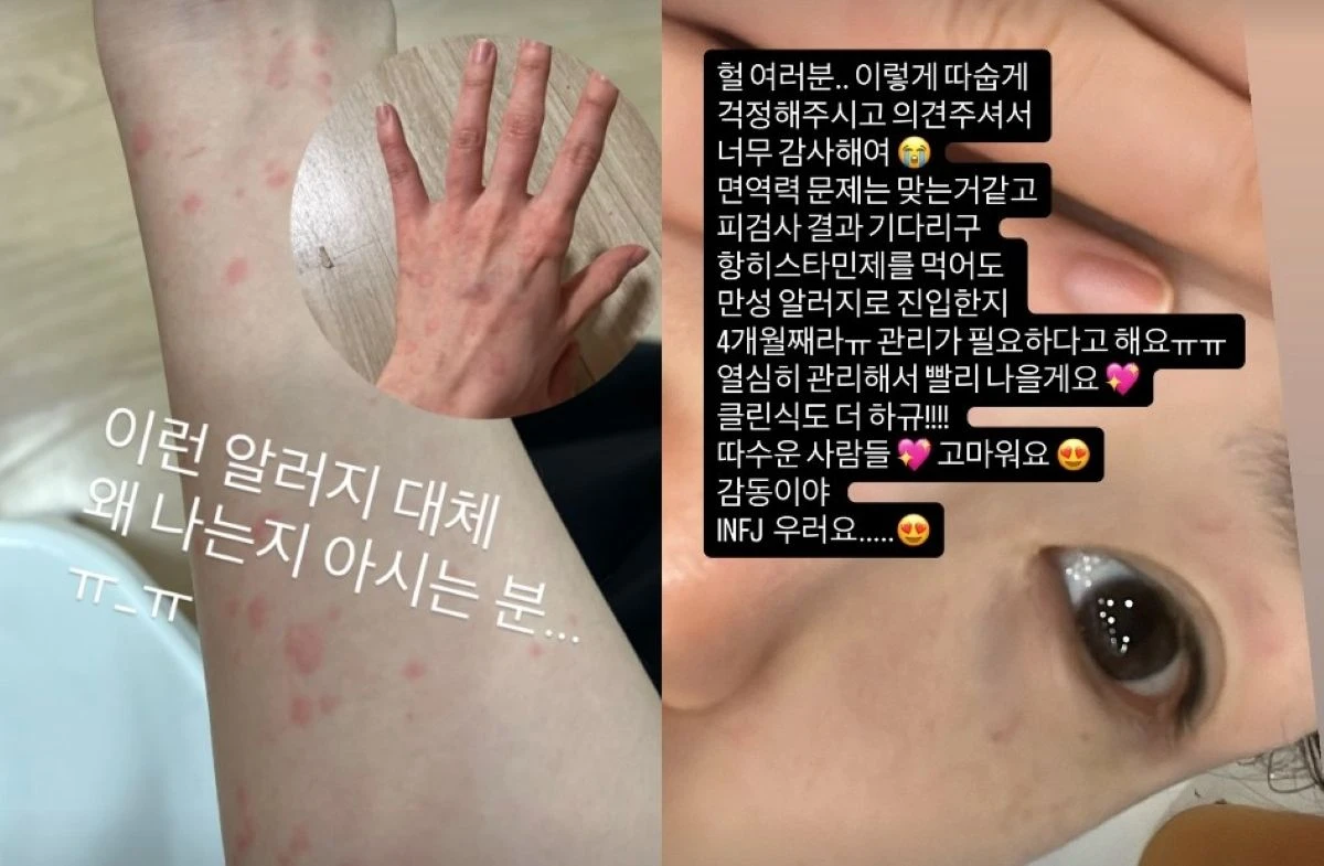 이어 "면역력 문제는 맞는 것 같고, 피검사 결과 기다리고 항히스타민제를 먹어도 만성 알러지로 진입한지 4개월째라 관리가 필요하다고 한다"라고 설명했다.