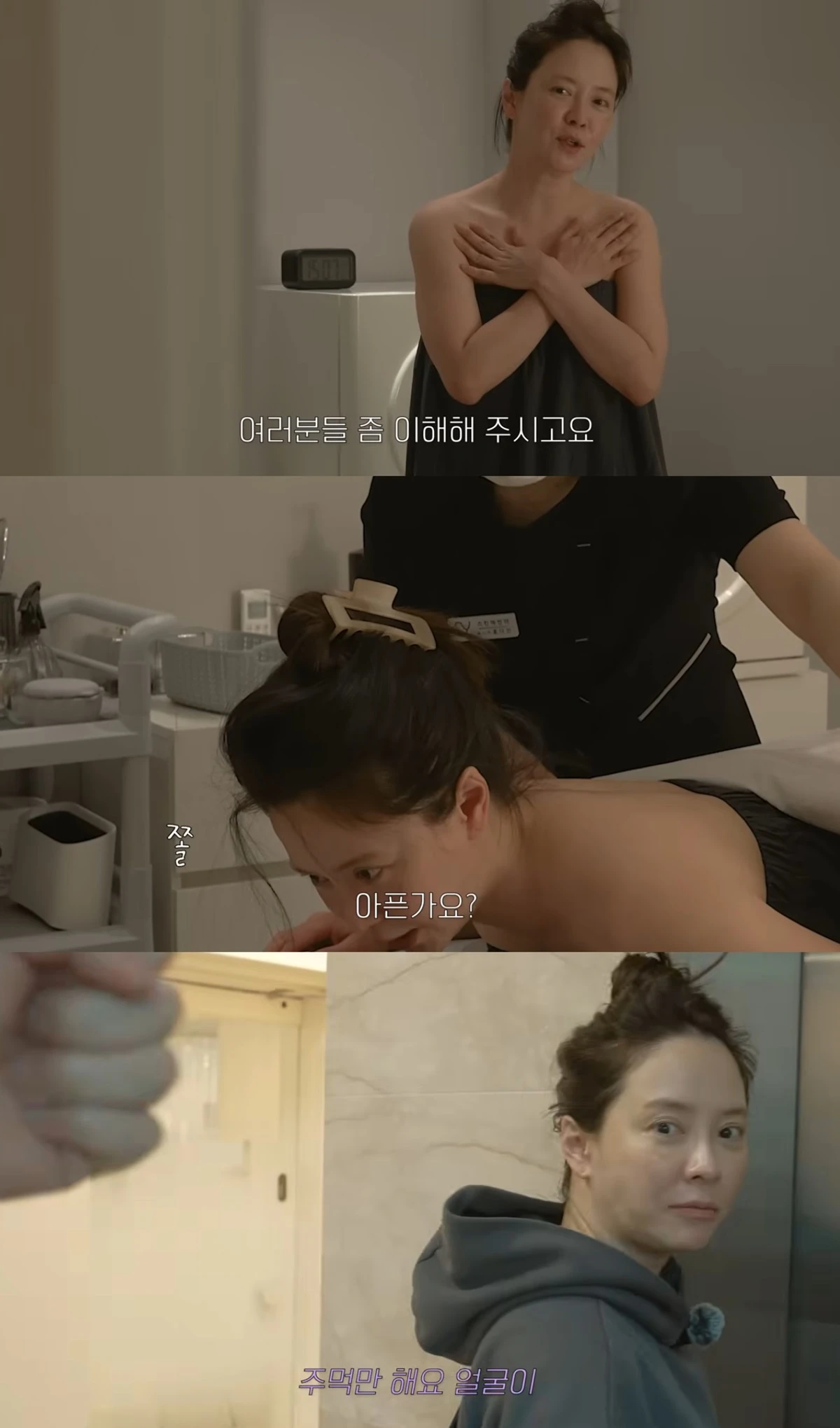 송지효는 "평소대로 해달라"고 직원에게 부탁하면서도, "저 맴매하는 거 아니냐"고 통증을 호소해 웃음을 자아냈다.
