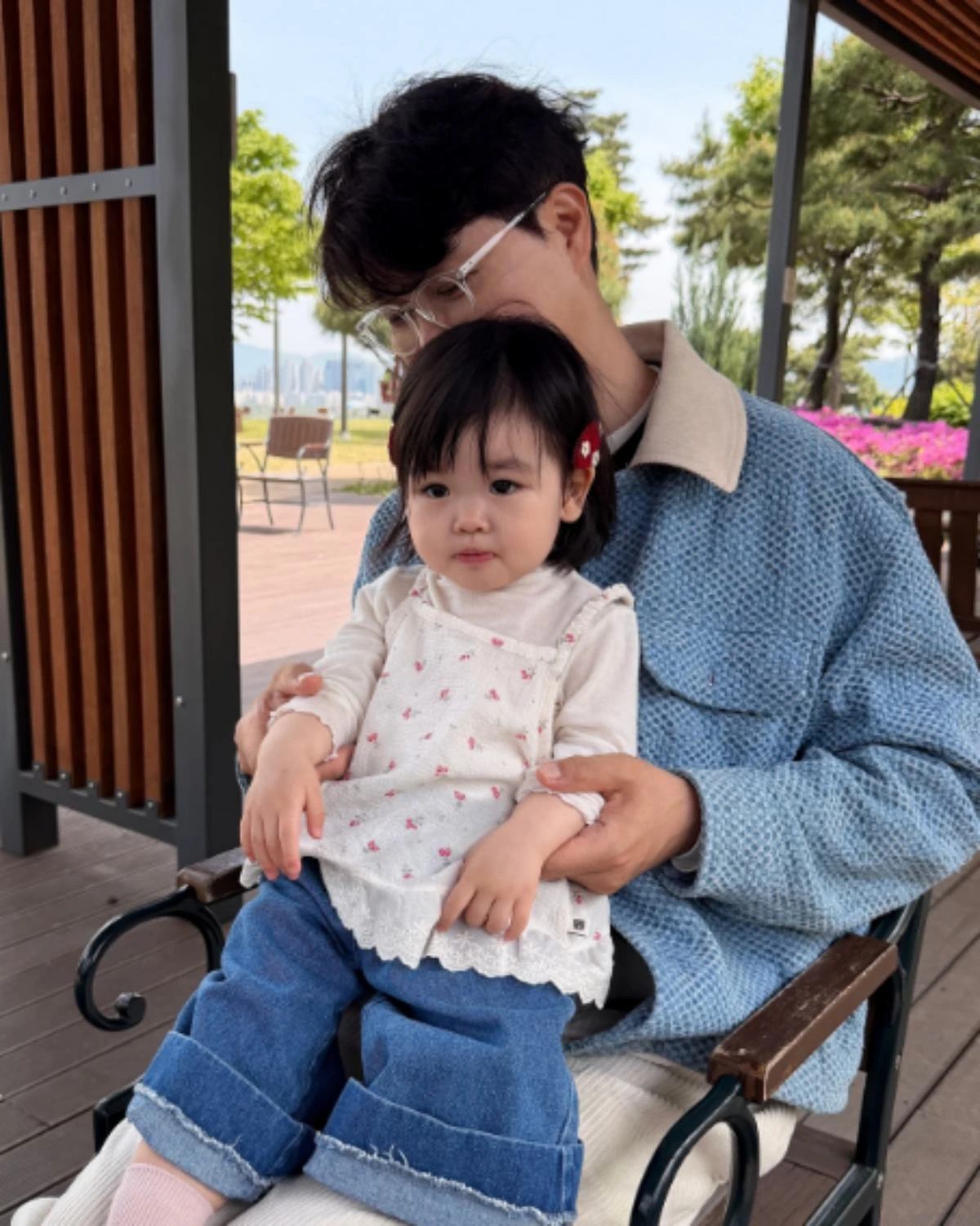 공개된 사진 속 박수홍은 쨍한 햇빛을 피해서 그늘 아래에 있는 벤치에 앉아 있으며 자신의 무릎에 딸 재이를 올려두고 함께 시간을 보내고 있다.