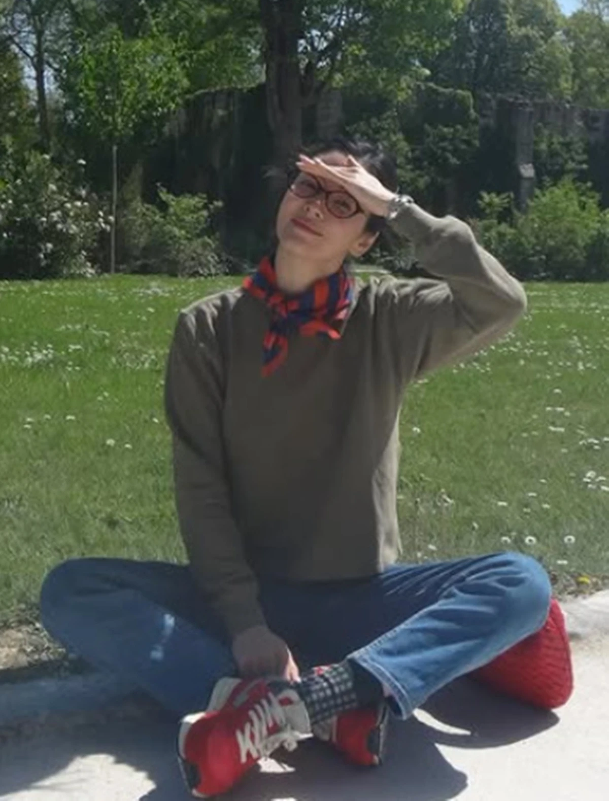 먼저 잔디 위에 앉아 햇살을 손으로 가리며 포즈를 취한 사진이 눈길을 끈다. 편안한 캐주얼 차림에도 변함없는 분위기가 시선을 사로잡았다.