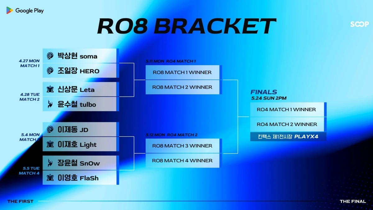 27일 오후 7시 진행되는 8강 1경기에서는 박상현과 조일장이 저그 동족전을 펼친다. 이어 28일 2경기에서는 신상문과 윤수철이 맞붙는다. 5월 4일 열리는 3경기에서는 이제동과 이재호가, 5일 4경기에서는 장윤철과 이영호가 각각 맞대결을 펼칠 예정이다. 특히 4경기는 지난 시즌8 결승전 리매치로 관심을 모은다.