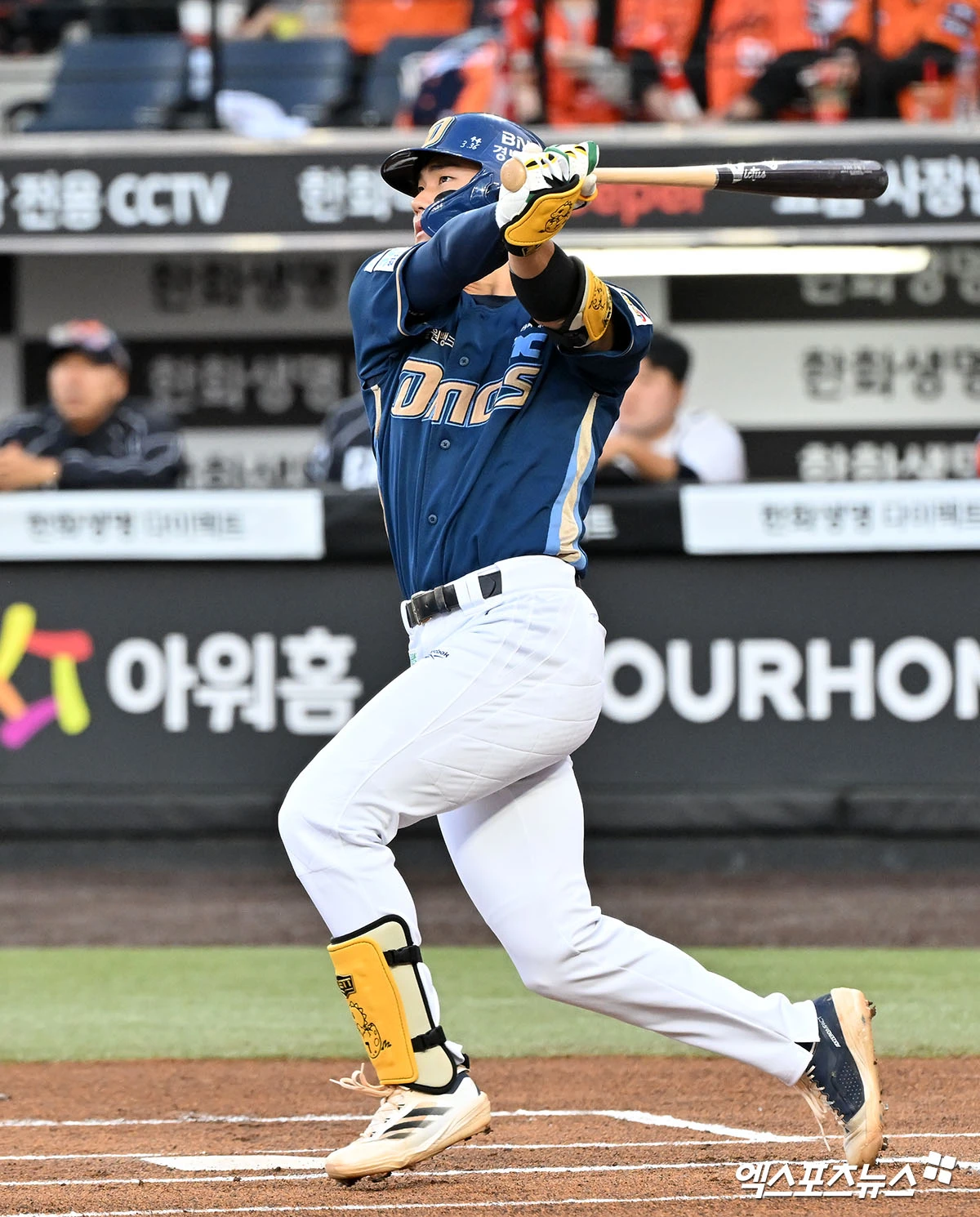 (엑스포츠뉴스 대전, 김한준 기자) 24일 오후 대전 한화생명 볼파크에서 열린 '2026 신한 SOL Bank KBO리그' NC 다이노스와 한화 이글스의 경기, 1회초 NC 김주원이 솔로 홈런을 날리고 있다.