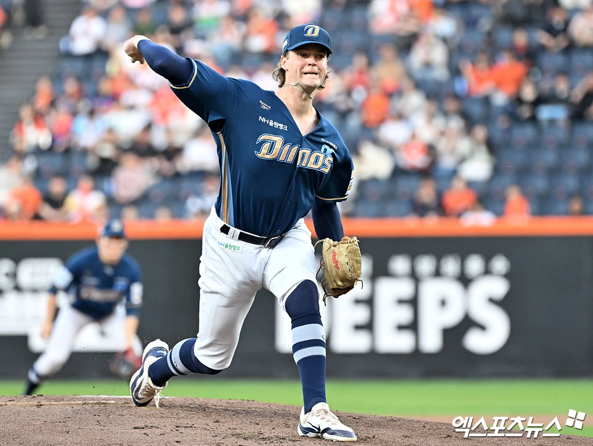 (엑스포츠뉴스 대전, 김한준 기자) 24일 오후 대전 한화생명 볼파크에서 열린 '2026 신한 SOL Bank KBO리그' NC 다이노스와 한화 이글스의 경기, 1회말 NC 선발투수 테일러가 공을 힘차게 던지고 있다.