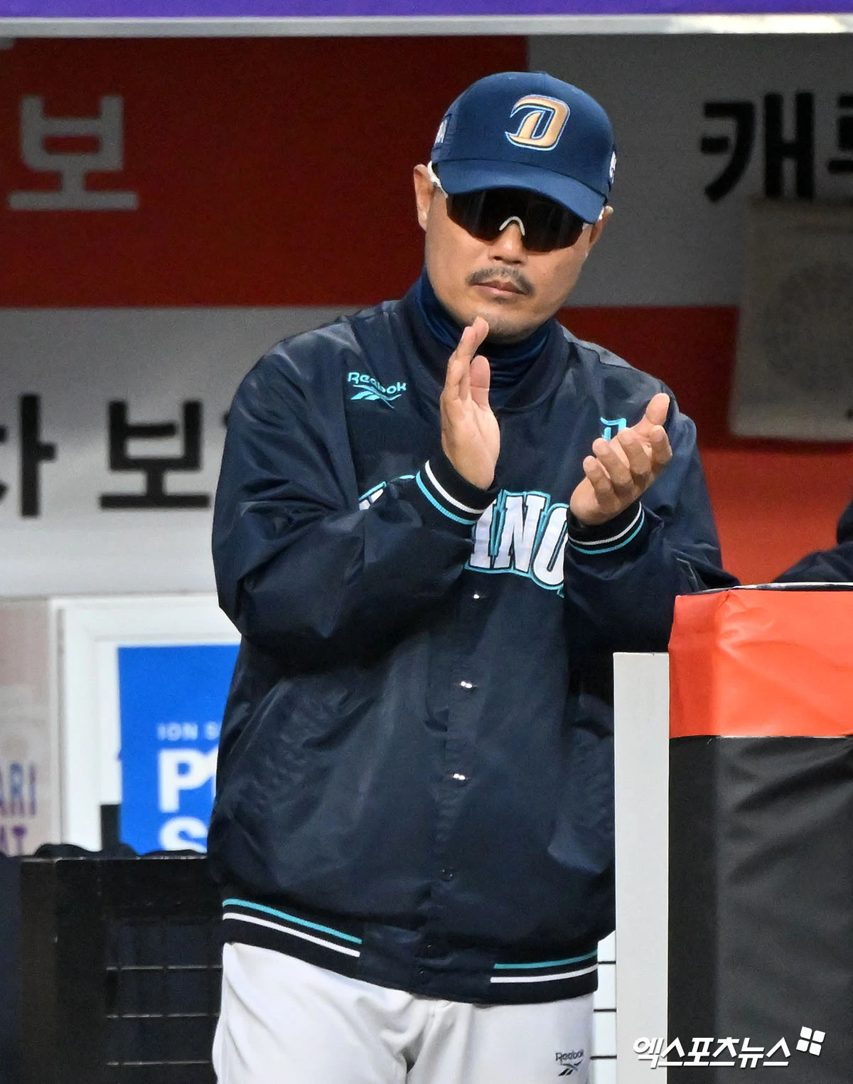 (엑스포츠뉴스 대전, 김한준 기자) 24일 오후 대전 한화생명 볼파크에서 열린 '2026 신한 SOL Bank KBO리그' NC 다이노스와 한화 이글스의 경기, 3회초 1사 3루 NC 이호준 감독이 득점한 고준휘에게 박수를 보내고 있다.