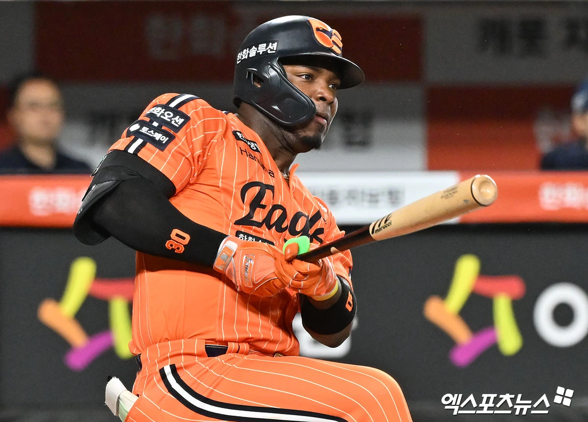 (엑스포츠뉴스 대전, 김한준 기자) 24일 오후 대전 한화생명 볼파크에서 열린 '2026 신한 SOL Bank KBO리그' NC 다이노스와 한화 이글스의 경기, 4회말 한화 페라자가 우전안타를 날리고 있다.