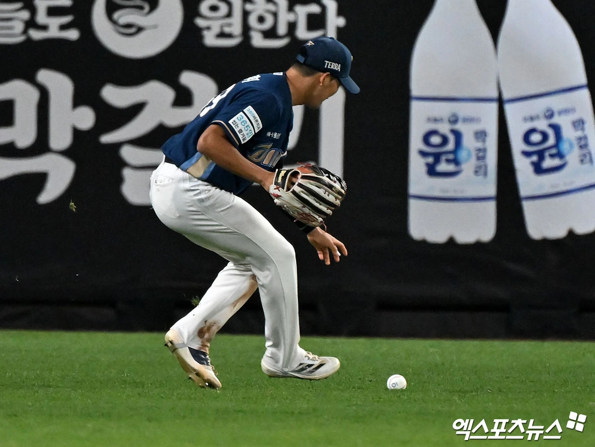 (엑스포츠뉴스 대전, 김한준 기자) 24일 오후 대전 한화생명 볼파크에서 열린 '2026 신한 SOL Bank KBO리그' NC 다이노스와 한화 이글스의 경기, 5회말 2사 3루 NC 고준휘가 포구실책을 하고 있다.