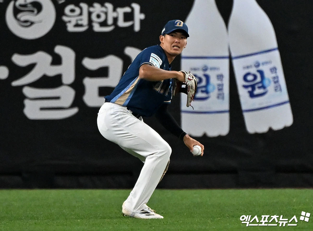 (엑스포츠뉴스 대전, 김한준 기자) 24일 오후 대전 한화생명 볼파크에서 열린 '2026 신한 SOL Bank KBO리그' NC 다이노스와 한화 이글스의 경기, 5회말 2사 3루 NC 고준휘가 포구실책을 하고 있다.