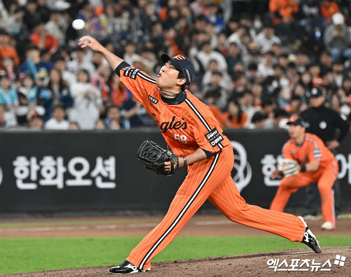 (엑스포츠뉴스 대전, 김한준 기자) 24일 오후 대전 한화생명 볼파크에서 열린 '2026 신한 SOL Bank KBO리그' NC 다이노스와 한화 이글스의 경기, 8회초 한화 박상원이 공을 힘차게 던지고 있다.