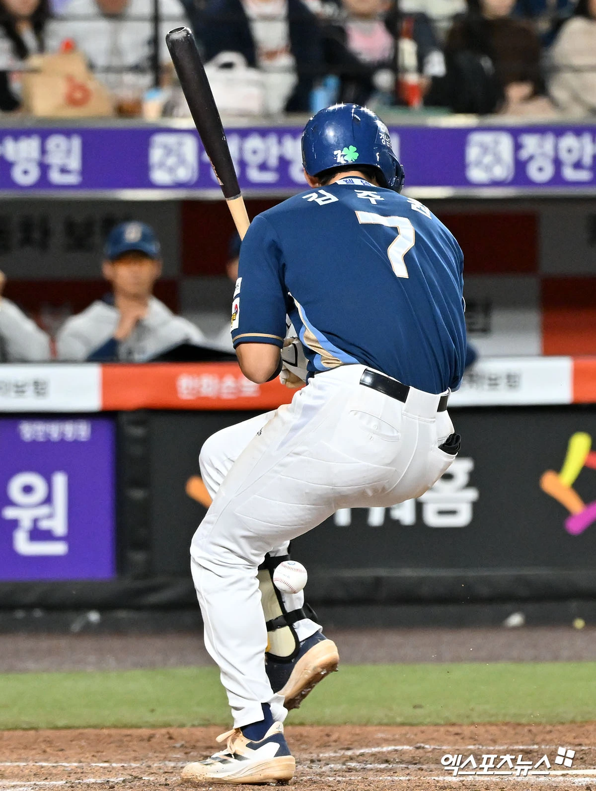 (엑스포츠뉴스 대전, 김한준 기자) 24일 오후 대전 한화생명 볼파크에서 열린 '2026 신한 SOL Bank KBO리그' NC 다이노스와 한화 이글스의 경기, 8회초 1사 2,3루 NC 김주원이 사구에 맞고 있다.