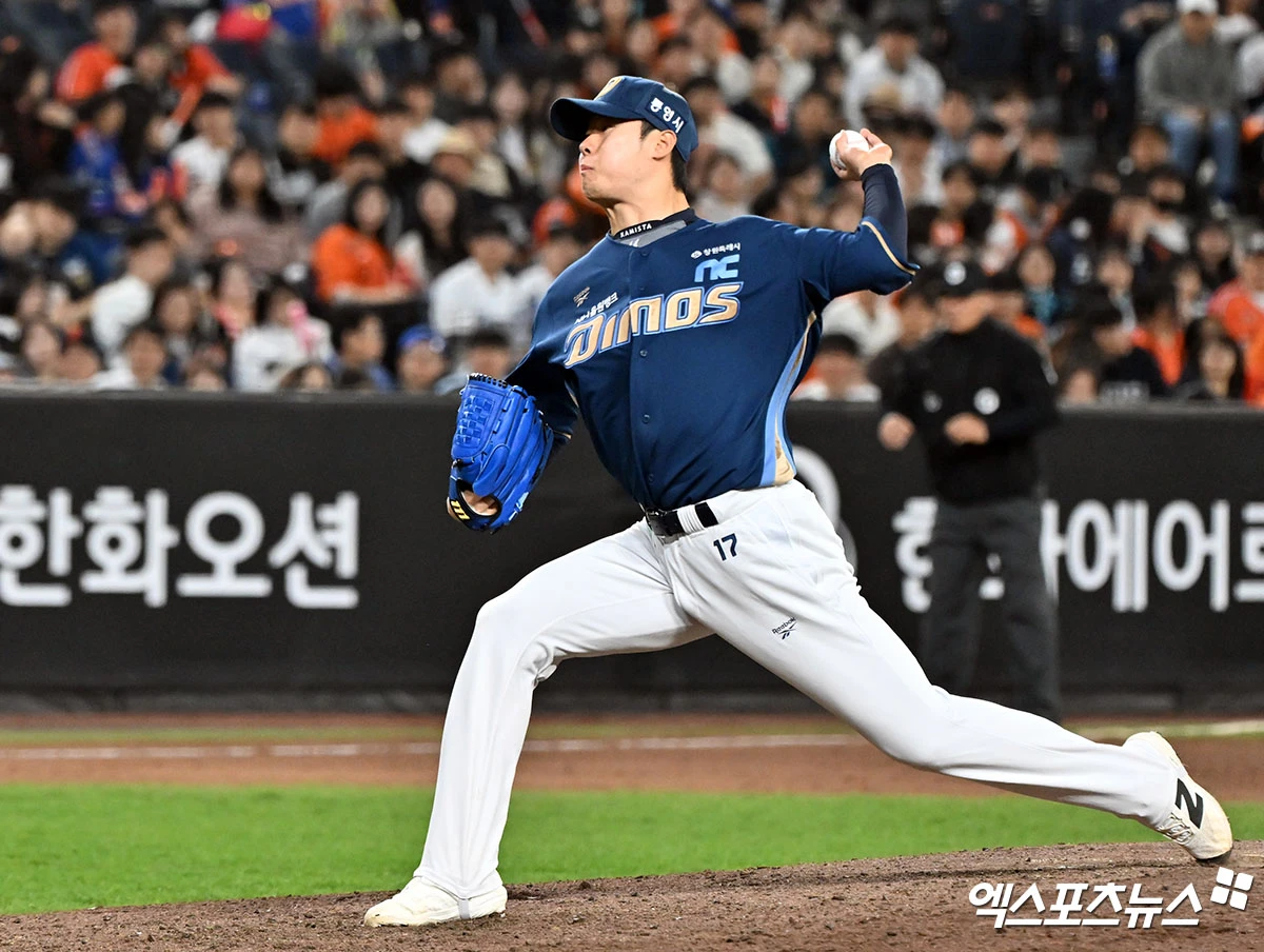 (엑스포츠뉴스 대전, 김한준 기자) 24일 오후 대전 한화생명 볼파크에서 열린 '2026 신한 SOL Bank KBO리그' NC 다이노스와 한화 이글스의 경기, 8회말 NC 김영규가 공을 힘차게 던지고 있다.
