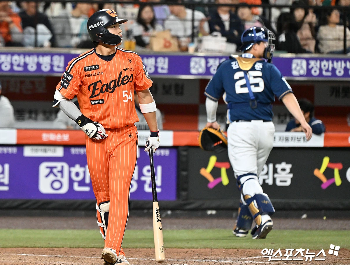 (엑스포츠뉴스 대전, 김한준 기자) 24일 오후 대전 한화생명 볼파크에서 열린 '2026 신한 SOL Bank KBO리그' NC 다이노스와 한화 이글스의 경기, 8회말 2사 한화 오재원이 루킹 삼진을 당하고 있다.