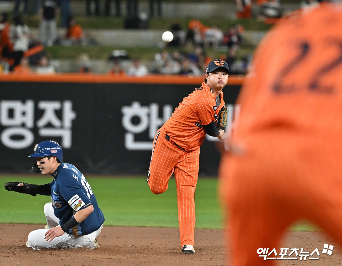 (엑스포츠뉴스 대전, 김한준 기자) 24일 오후 대전 한화생명 볼파크에서 열린 '2026 신한 SOL Bank KBO리그' NC 다이노스와 한화 이글스의 경기, 9회초 무사 1루 한화 이도윤이 NC 한재환의 내야땅볼때 도태훈을 포스아웃 시킨 후 1루로 송구하고 있다.