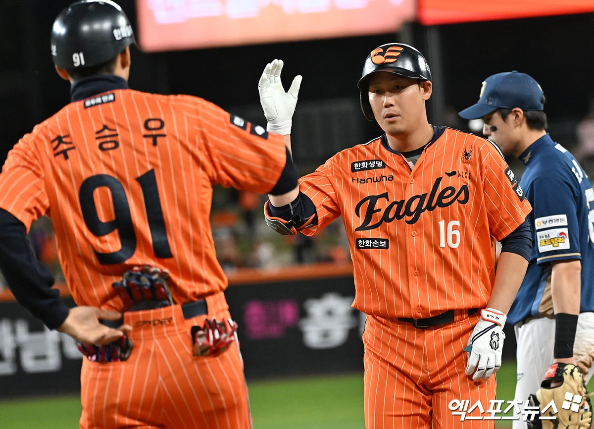 (엑스포츠뉴스 대전, 김한준 기자) 24일 오후 대전 한화생명 볼파크에서 열린 '2026 신한 SOL Bank KBO리그' NC 다이노스와 한화 이글스의 경기, 9회말 2사 한화 하주석이 중전안타를 날리고 있다.