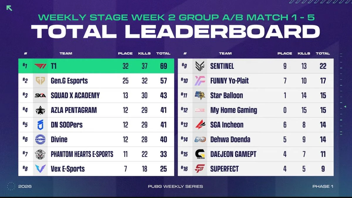 (엑스포츠뉴스 이정범 기자) '2026 PWS: 페이즈 1’ T1이 위클리 스테이지 2주 차 그룹 B·A조 1위에 올랐다.