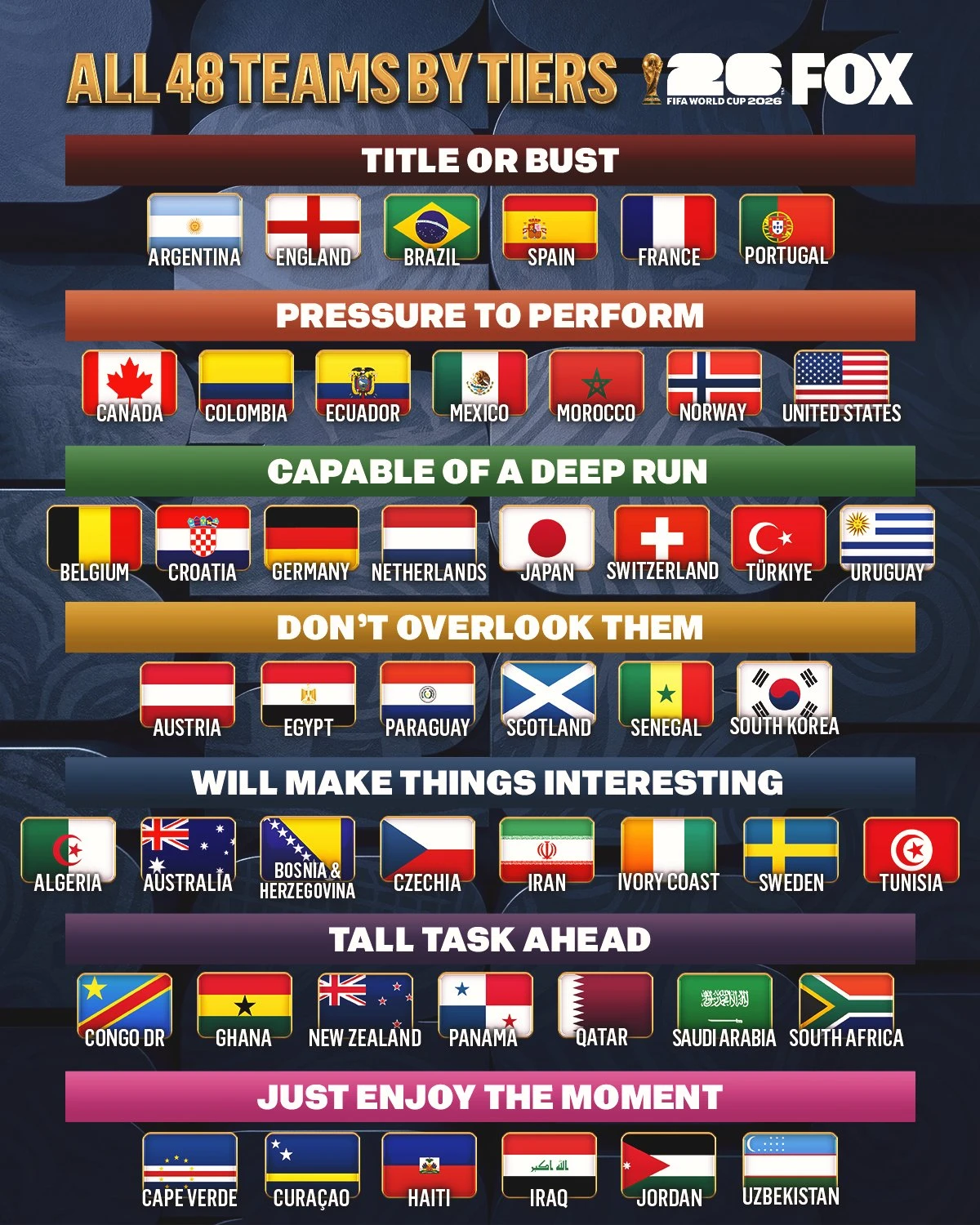 미국 폭스스포츠는 지난 24일(한국시간) 2026 북중미 월드컵에 출전하는 48개국을 티어 별로 나누어 소개했다.