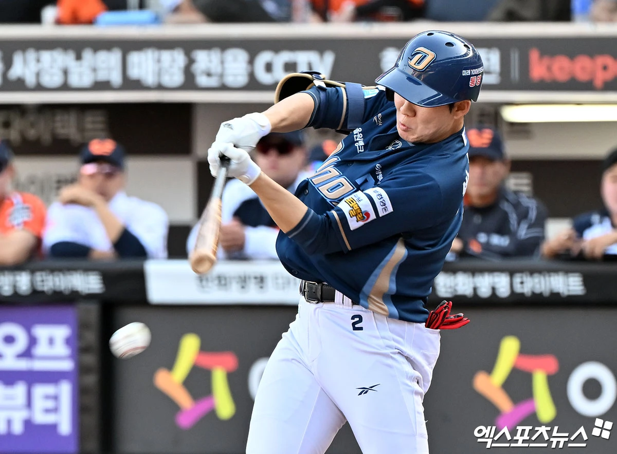 (엑스포츠뉴스 대전, 김한준 기자) 25일 오후 대전 한화생명 볼파크에서 열린 '2026 신한 SOL Bank KBO리그' NC 다이노스와 한화 이글스의 경기, 1회초 2사 1루 NC 박민우가 우전안타를 날리고 있다.