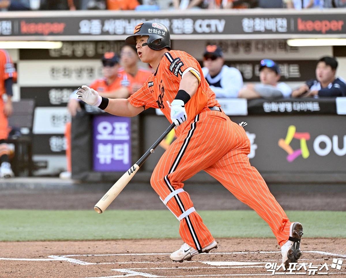 (엑스포츠뉴스 대전, 김한준 기자) 25일 오후 대전 한화생명 볼파크에서 열린 '2026 신한 SOL Bank KBO리그' NC 다이노스와 한화 이글스의 경기, 1회말 2사 1루 한화 노시환이 2루타를 날리고 있다.