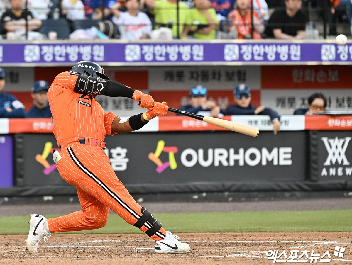 (엑스포츠뉴스 대전, 김한준 기자) 25일 오후 대전 한화생명 볼파크에서 열린 '2026 신한 SOL Bank KBO리그' NC 다이노스와 한화 이글스의 경기, 5회말 2사 3루 한화 페라자가 투런 홈런을 날리고 있다.