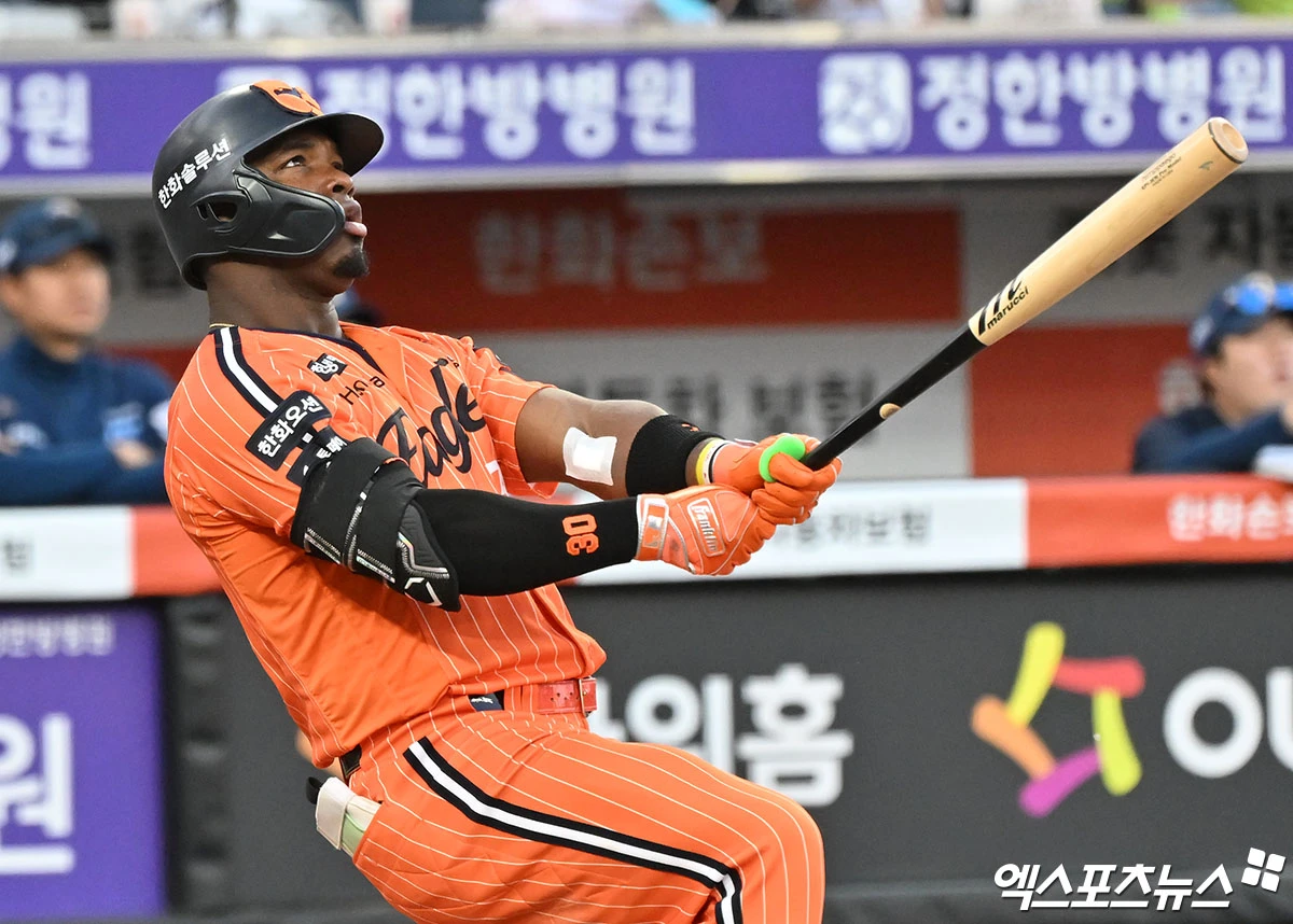 (엑스포츠뉴스 대전, 김한준 기자) 25일 오후 대전 한화생명 볼파크에서 열린 '2026 신한 SOL Bank KBO리그' NC 다이노스와 한화 이글스의 경기, 5회말 2사 3루 한화 페라자가 투런 홈런을 날리고 있다.
