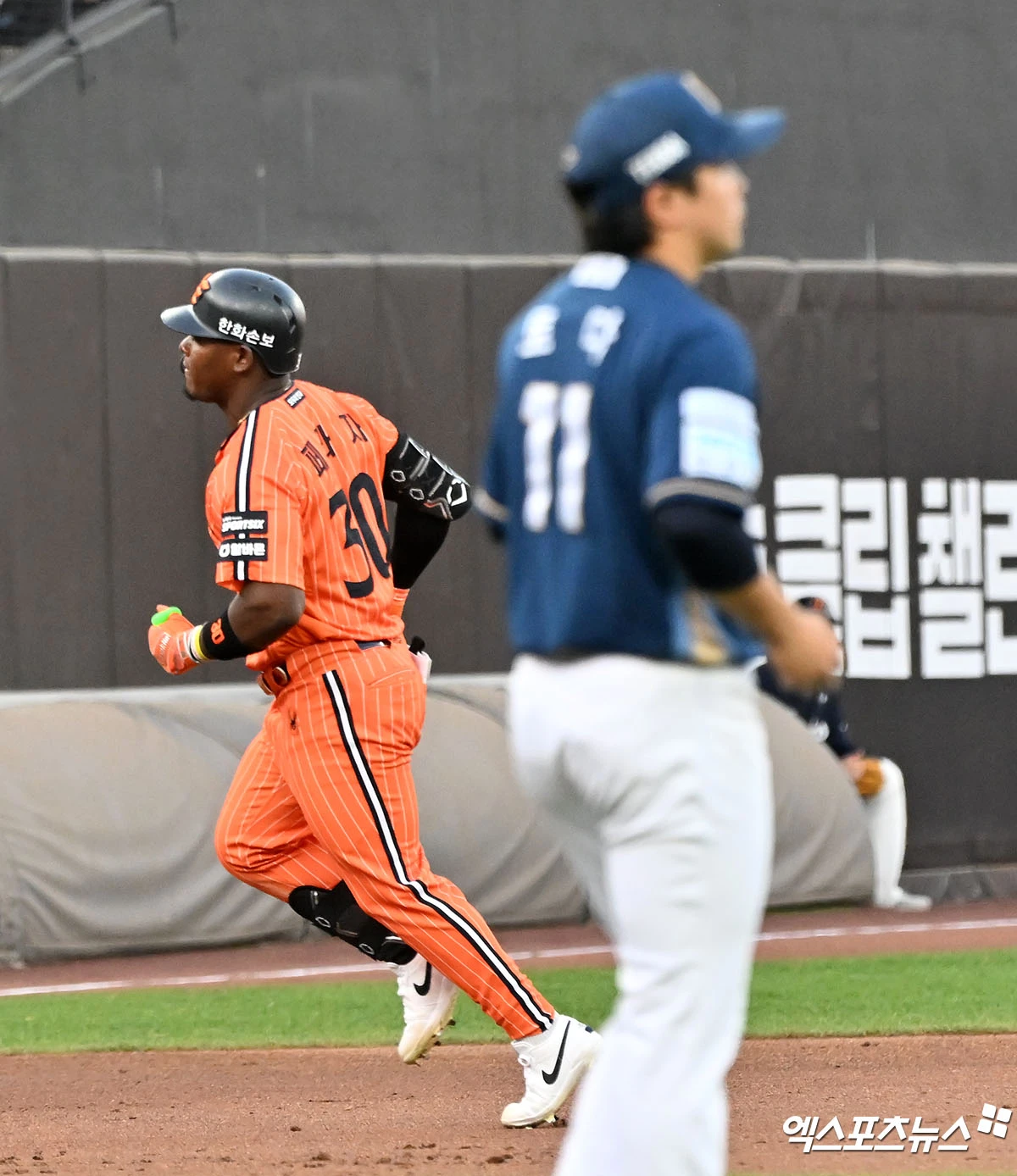 (엑스포츠뉴스 대전, 김한준 기자) 25일 오후 대전 한화생명 볼파크에서 열린 '2026 신한 SOL Bank KBO리그' NC 다이노스와 한화 이글스의 경기, 5회말 2사 3루 한화 페라자가 투런 홈런을 날린 후 기뻐하고 있다.