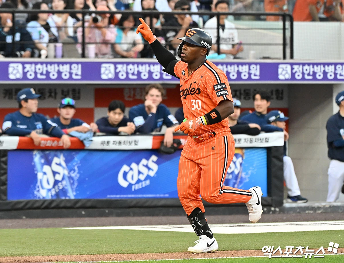 (엑스포츠뉴스 대전, 김한준 기자) 25일 오후 대전 한화생명 볼파크에서 열린 '2026 신한 SOL Bank KBO리그' NC 다이노스와 한화 이글스의 경기, 5회말 2사 3루 한화 페라자가 투런 홈런을 날린 후 기뻐하고 있다.