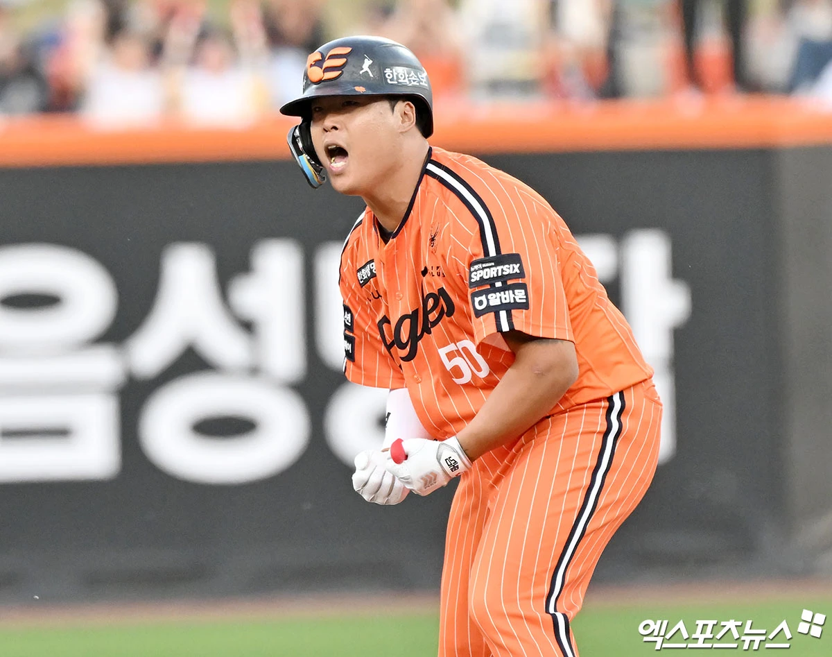 (엑스포츠뉴스 대전, 김한준 기자) 25일 오후 대전 한화생명 볼파크에서 열린 '2026 신한 SOL Bank KBO리그' NC 다이노스와 한화 이글스의 경기, 5회말 2사 2,3루 한화 강백호가 2타점 2루타를 날린 후 기뻐하고 있다.