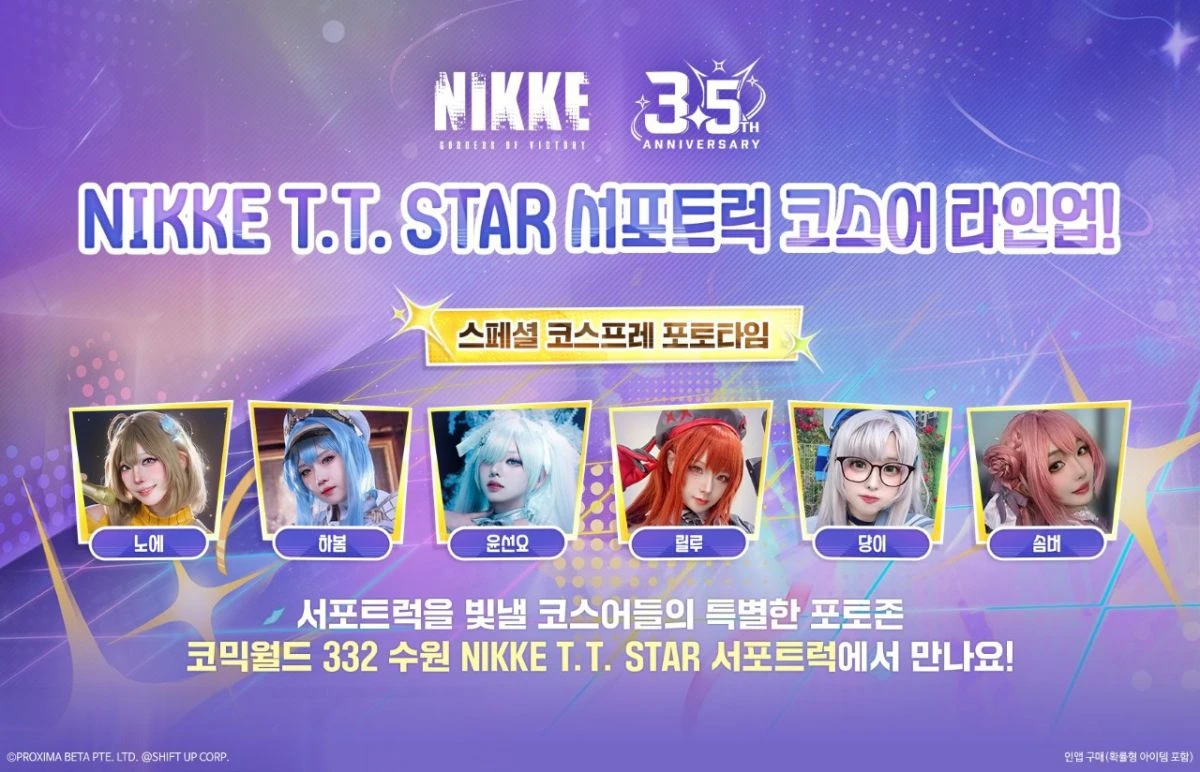 다양한 이벤트도 펼쳐진다. 먼저, '승리의 여신: 니케' 앱을 실행해 본인의 계정을 인증하는 이용자는 3.5주년 한정판 스티커와 T.T. STAR 포토카드 1종을 받을 수 있다.