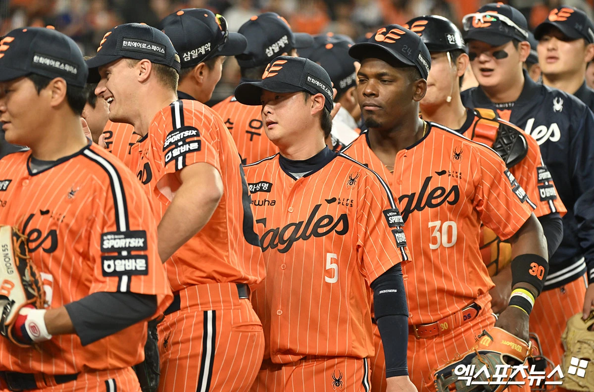 이날 경기에서 승리한 한화 선수단이 기뻐하고 있다.