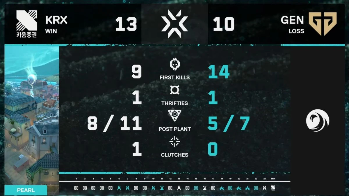 후반전 돌입 이후 크게 실점했으나, 21라운드에 매치 포인트를 따내며 다시 중심을 잡고자 한 키움 DRX. 하지만 상대가 1점만 더 가져가면 되는 상황에서도 젠지의 추격은 계속돼 23라운드 기준 11대12로 점수를 1점 차이로 좁혔다.