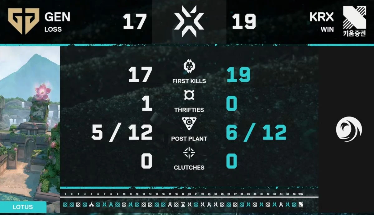 맵 스코어 1대1 상태에서 세 번째 맵 로터스에 입장한 2팀. 초반 흐름은 키움 DRX가 좋았다. 8라운드 기준 6대2로 점수를 더 많이 가져간 것. 이들은 이후에도 지속해서 분위기를 끌어올렸고, 전반전을 9대3으로 마무리했다.