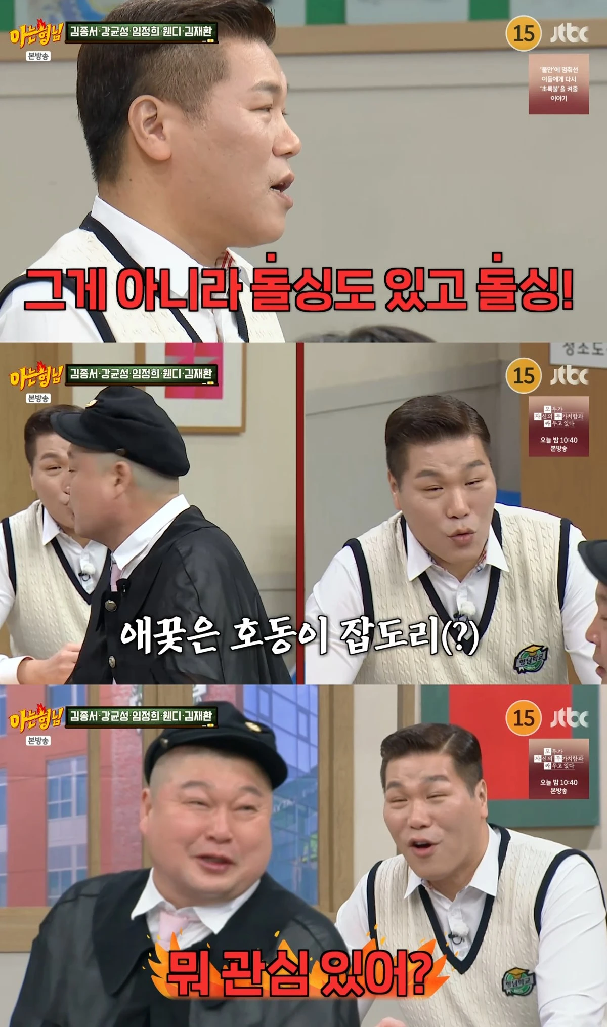 강호동은 "돌자 중에 돌아이도 있고 돌싱도 있는데 돌고래가 낫지 않냐"라며 자연스럽게 화제를 돌렸다. 하지만 이를 놓치지 않고 강균성은 "호동이 얼굴이 너무 빨개졌다. 가공육 같다"고 해 웃음을 자아냈다.