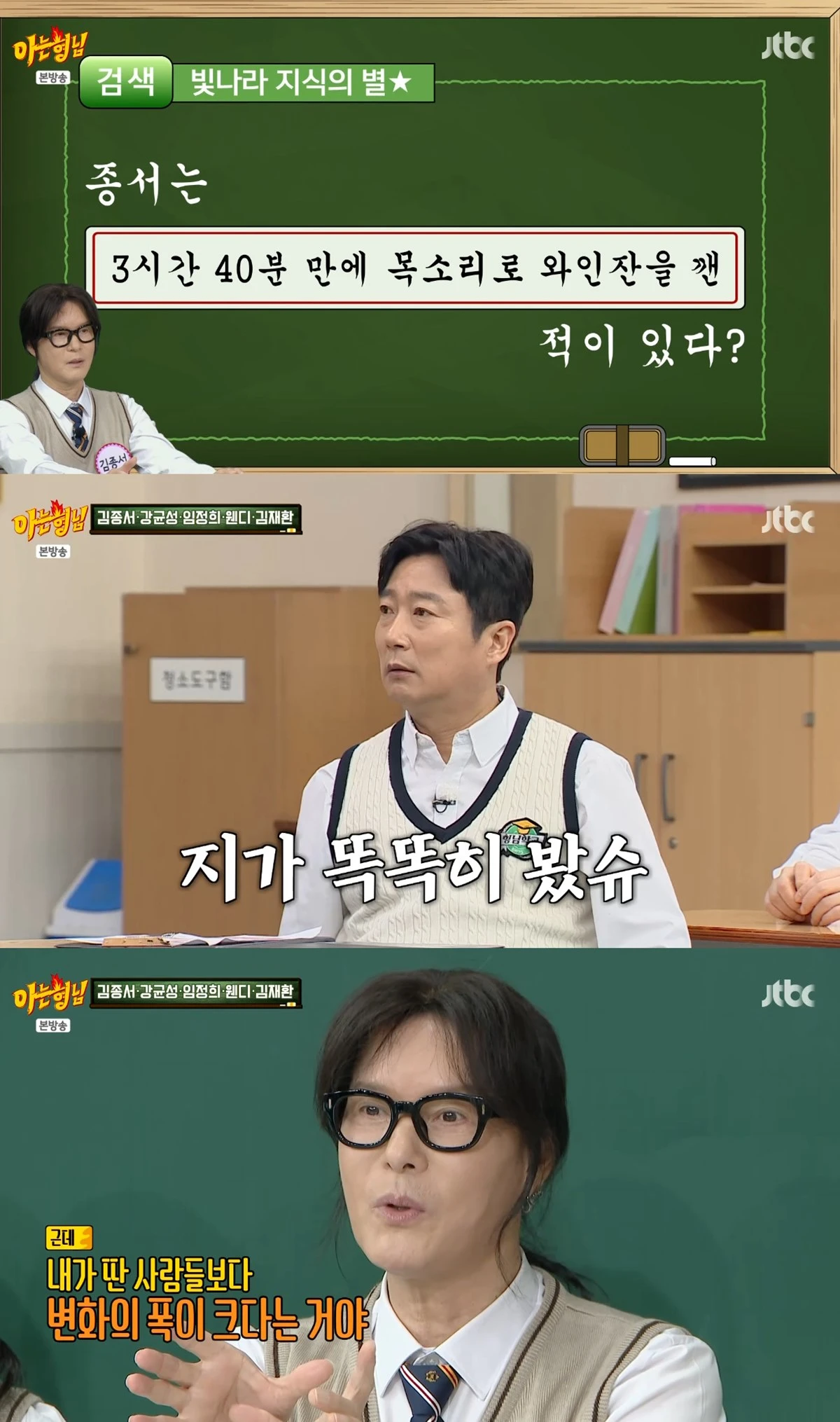 이날 김종서는 3시간 40분 만에 목소리로 와인잔을 깬 적이 있다고 밝혔다. 이수근 또한 "일정한 소리를 내면 컵을 깨는 걸 한 적이 있었다"며 KBS '스펀지'에서 함께 실험을 했다고 강조했다.