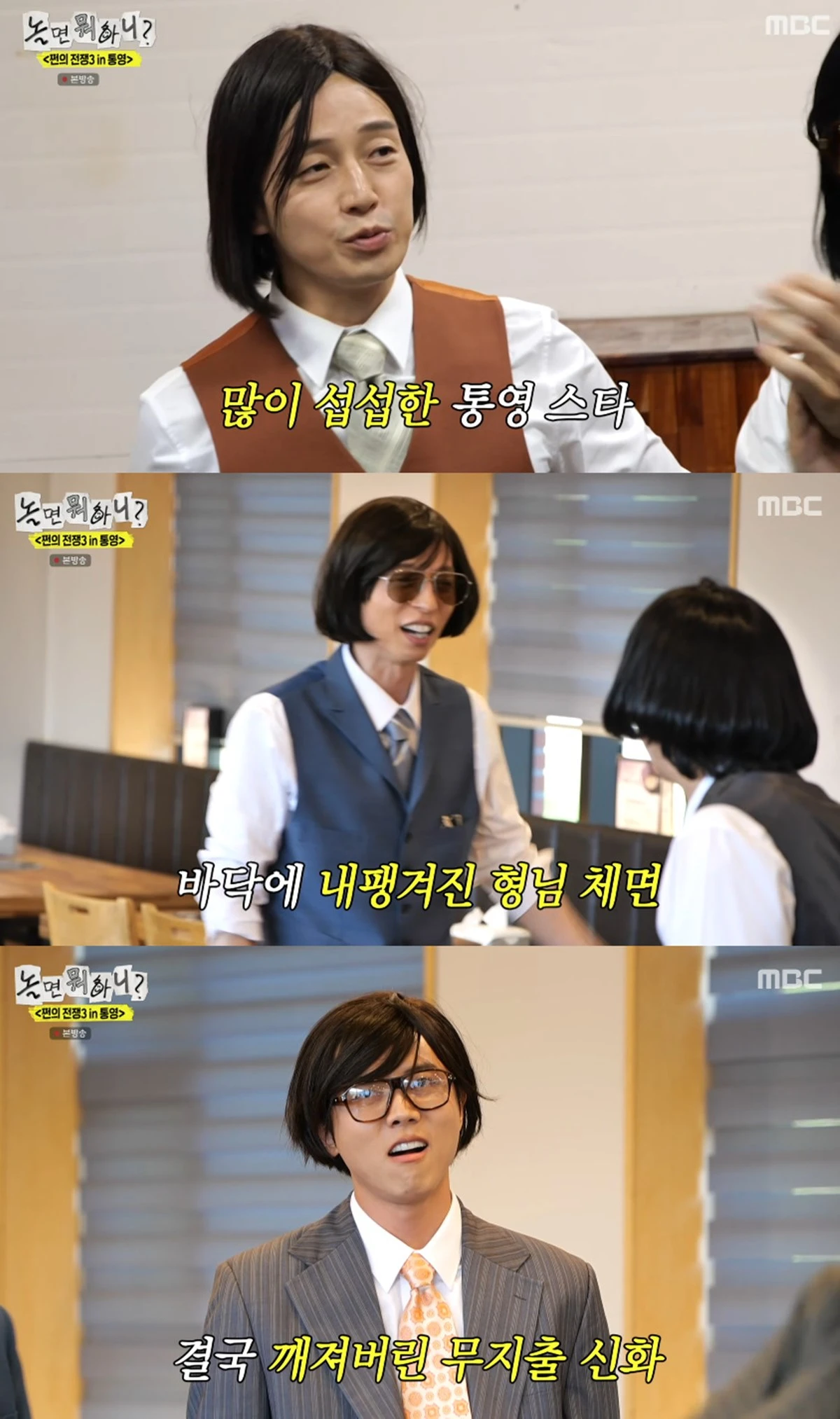 25일 방송된 MBC 예능프로그램 ‘놀면 뭐하니?’는 ‘촌놈들의 전성시대-쩐의 전쟁3 in 통영’ 편으로 꾸며졌다. 이날 유재석, 하하, 주우재, 양상국은 ‘통영 스타’ 허경환의 초대로 통영을 방문했다.