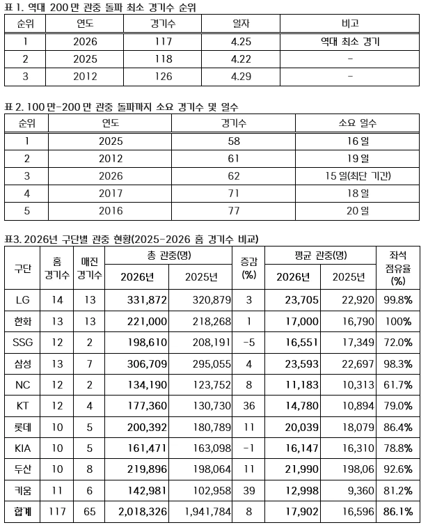 이로써 25일까지 누적 관중 209만4481명을 기록한 KBO리그는 역대 최소 경기인 117경기 만에 200만 관중을 달성했다. 종전 역대 최소 경기 200만 관중 돌파는 118경기 만에 달성했던 2025시즌이다. 이날 117경기 만에 달성함에 따라 종전 기록보다 1경기를 줄여 역대 최소 경기 달성 기록을 경신했다. 지난해 누적 관중 수는 1231만2519명이었다.