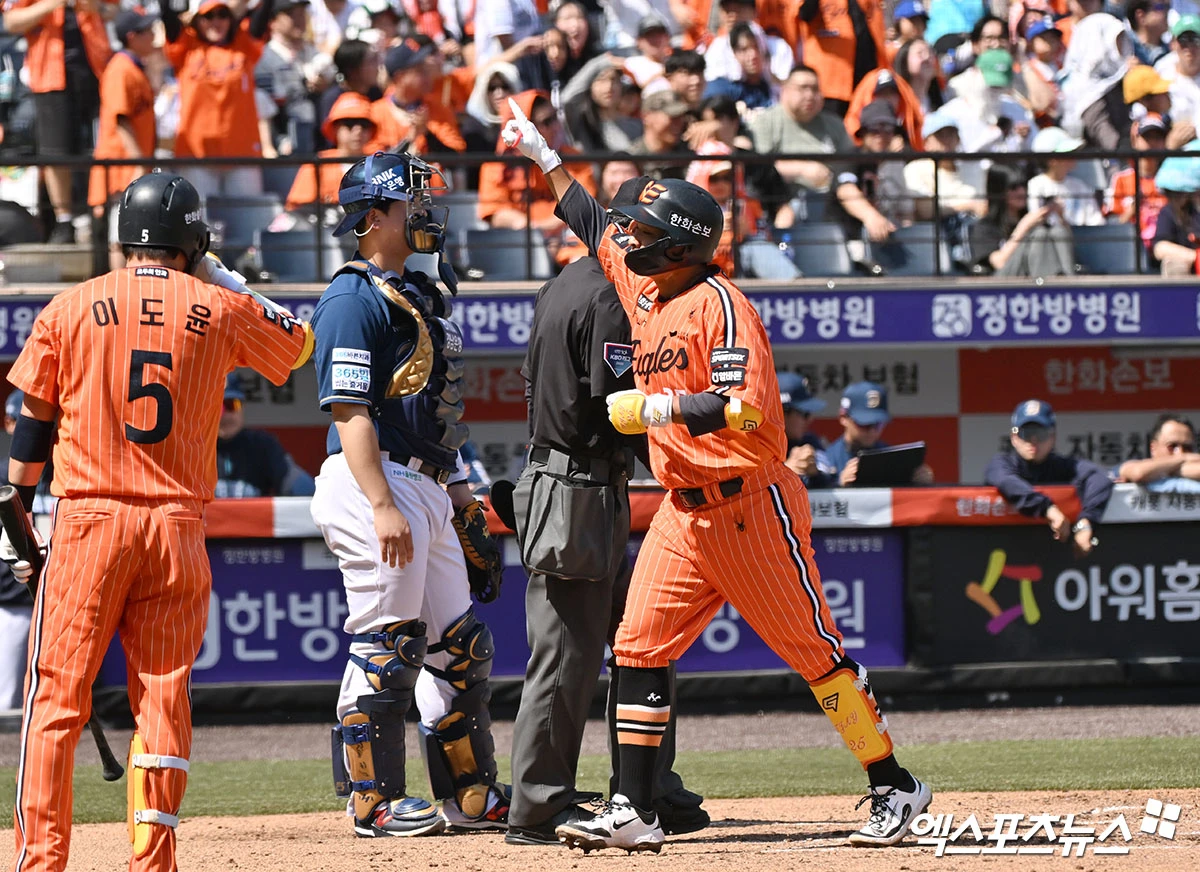 (엑스포츠뉴스 대전, 김한준 기자) 26일 오후 대전 한화생명 볼파크에서 열린 '2026 신한 SOL Bank KBO리그' NC 다이노스와 한화 이글스의 경기, 2회말 한화 김태연이 솔로 홈런을 날린 후 기뻐하고 있다.