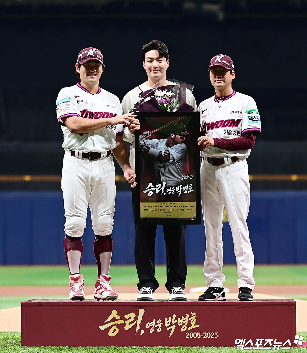 (엑스포츠뉴스 고척, 박지영 기자) 26일 오후 서울 구로구 고척스카이돔에서 열리는 '2026 신한 SOL Bank KBO 리그' 삼성 라이온즈와 키움 히어로즈의 경기에 앞서 키움 박병호의 은퇴식이 진행됐다. 키움 임지열, 설종진 감독이 박병호와 기념 촬영을 하고 있다.