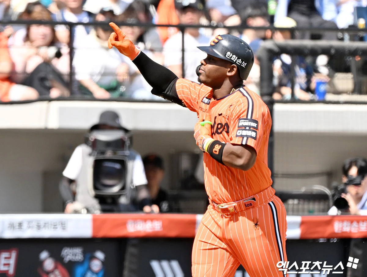 (엑스포츠뉴스 대전, 김한준 기자) 26일 오후 대전 한화생명 볼파크에서 열린 '2026 신한 SOL Bank KBO리그' NC 다이노스와 한화 이글스의 경기, 1회말 무사 1루 한화 페라자가 투런 홈런을 날린 후 기뻐하고 있다.