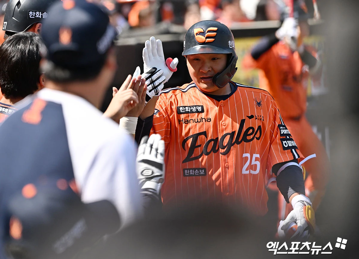 (엑스포츠뉴스 대전, 김한준 기자) 26일 오후 대전 한화생명 볼파크에서 열린 '2026 신한 SOL Bank KBO리그' NC 다이노스와 한화 이글스의 경기, 2회말 한화 김태연이 솔로 홈런을 날린 후 기뻐하고 있다.