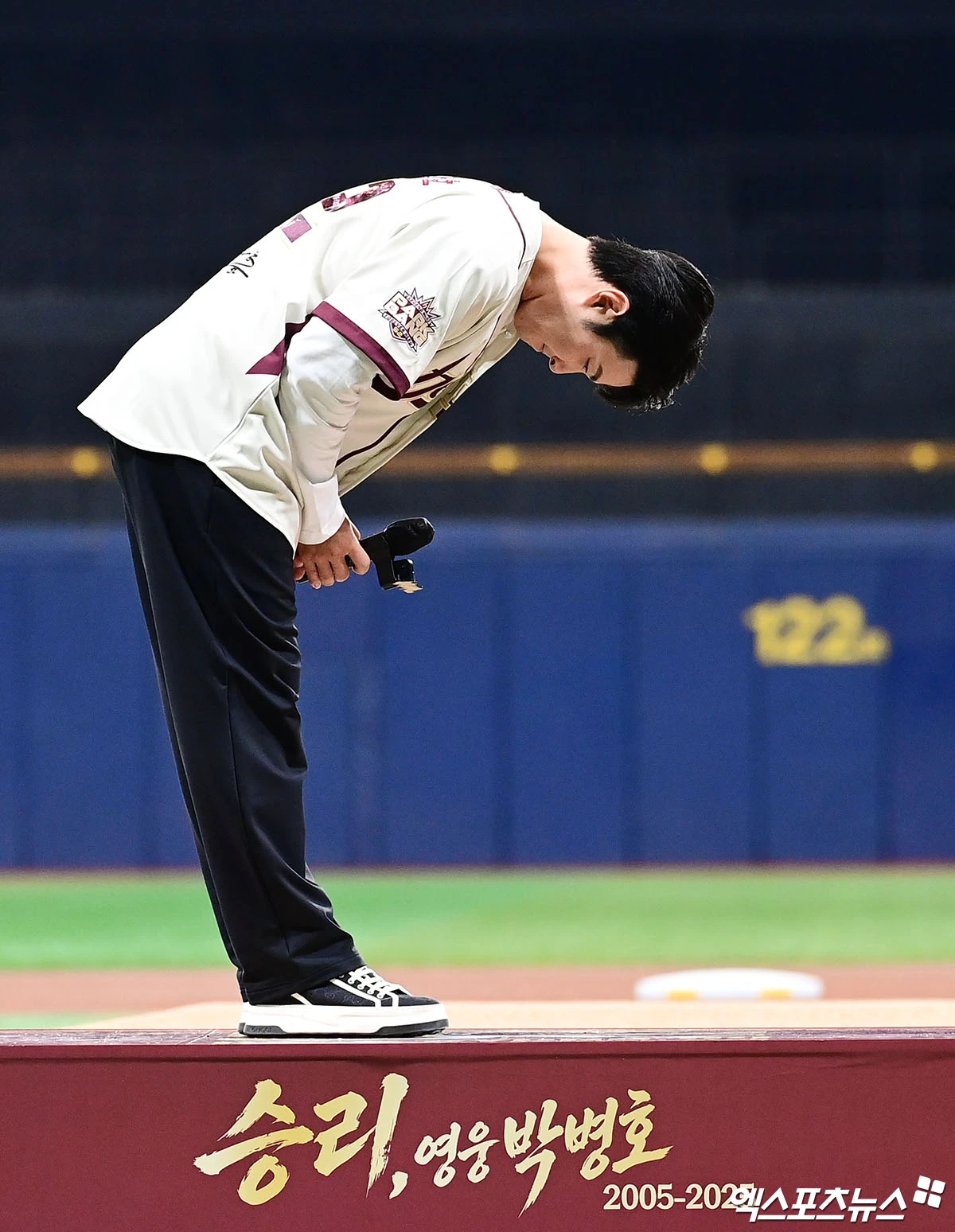 (엑스포츠뉴스 고척, 박지영 기자) 26일 오후 서울 구로구 고척스카이돔에서 열리는 '2026 신한 SOL Bank KBO 리그' 삼성 라이온즈와 키움 히어로즈의 경기에 앞서 키움 박병호의 은퇴식이 진행됐다. 박병호가 히어로즈 팬들을 향해 인사하고 있다.