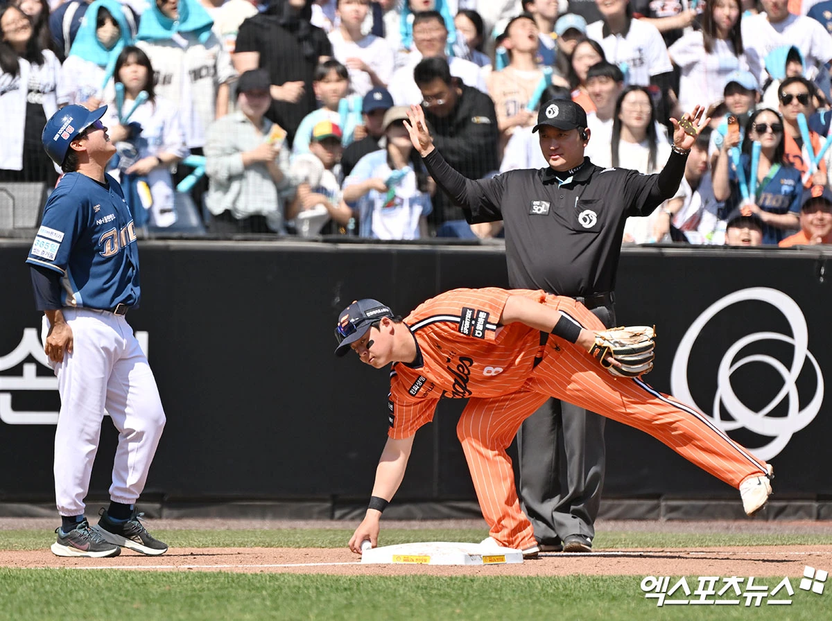 (엑스포츠뉴스 대전, 김한준 기자) 26일 오후 대전 한화생명 볼파크에서 열린 '2026 신한 SOL Bank KBO리그' NC 다이노스와 한화 이글스의 경기, 3회초 한화 노시환이 NC 최정원의 번트 타구가 파울 라인을 벗어나길 기다리고 있다.