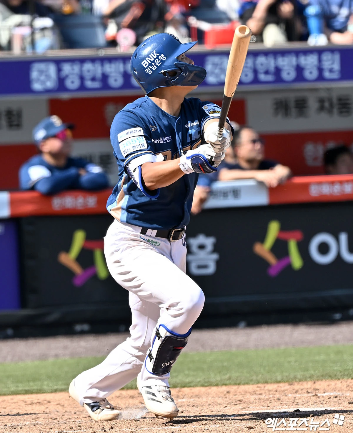(엑스포츠뉴스 대전, 김한준 기자) 26일 오후 대전 한화생명 볼파크에서 열린 '2026 신한 SOL Bank KBO리그' NC 다이노스와 한화 이글스의 경기, 5회초 2사 NC 고준휘가 타격을 하고 있다. 결과는 좌익수 플라이 아웃.